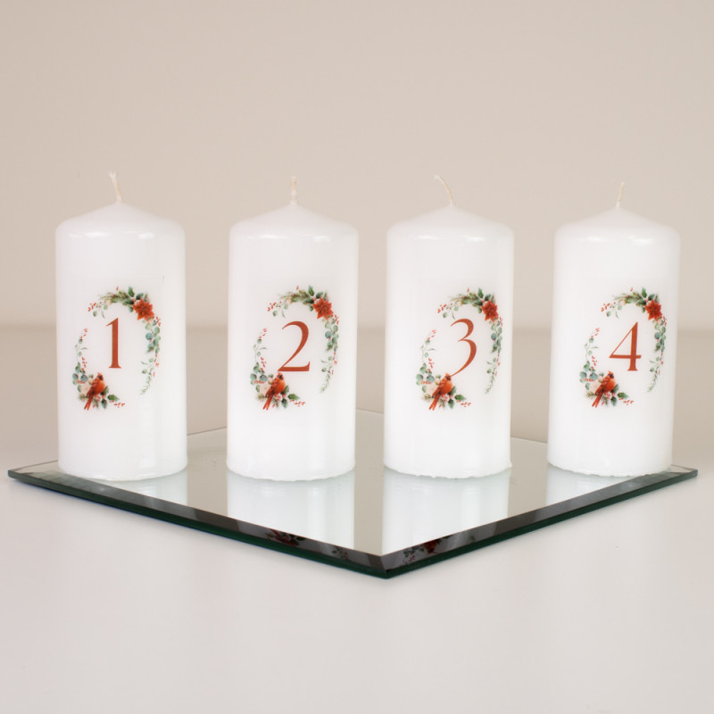 Ovaj poseban set bijelih svijeća sadrži četiri komada, ukrašena elegantnim zimskim motivima i brojevima 1, 2, 3 i 4, koji simboliziraju četiri tjedna adventa.
