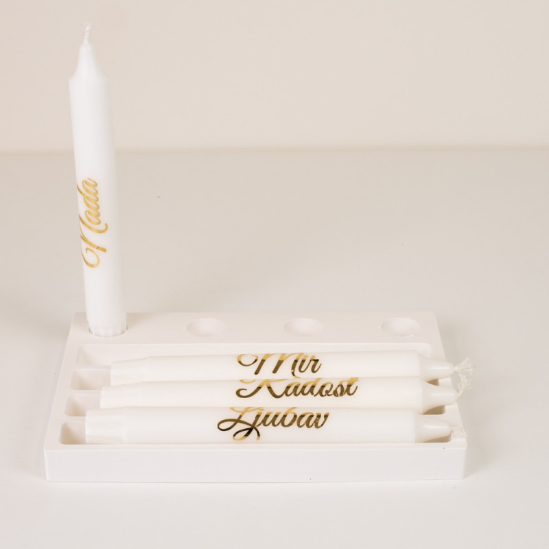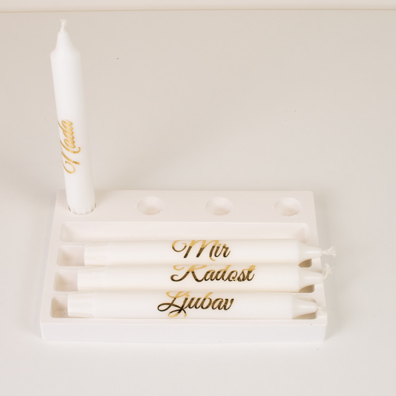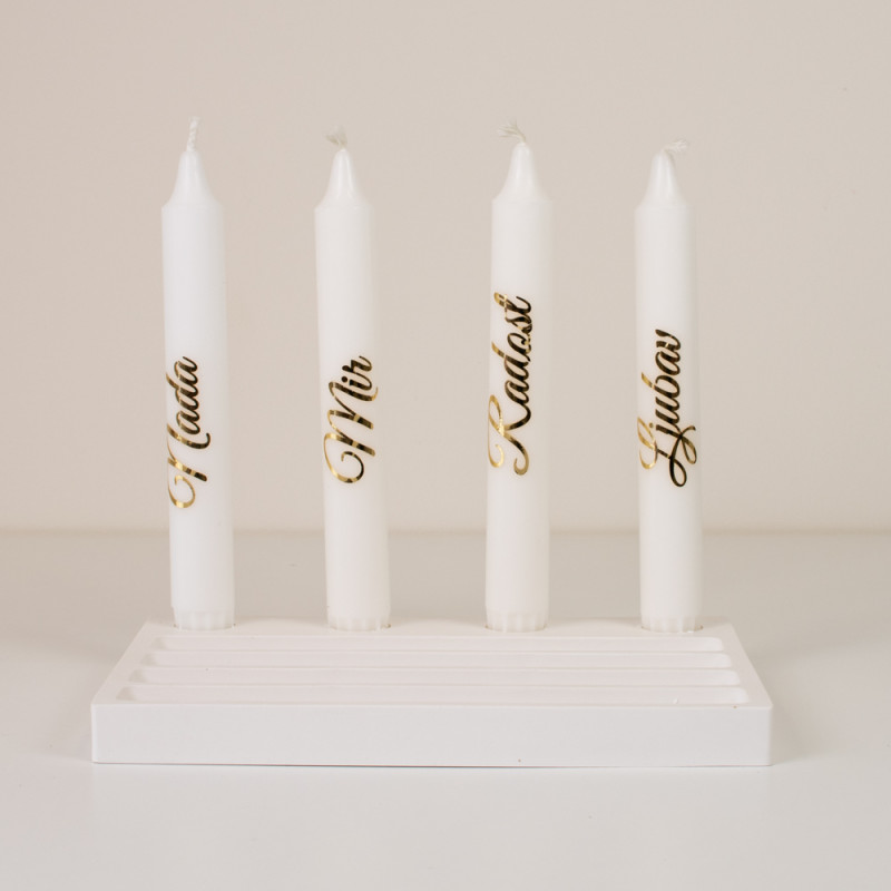 Set od četiri adventske svijeće 8×5 cm SANDEA sa zlatnim natpisima “Nada”, “Mir”, “Radost” i “Ljubav”. Ove elegantne i luksuzne bijele svijeće unose toplinu, svjetlost i profinjenost u vaš blagdanski dom. Idealne za adventski set svijeća, poklon ili stolnu dekoraciju. Prodaju se u setu od 4 komada, bez svijećnjaka.