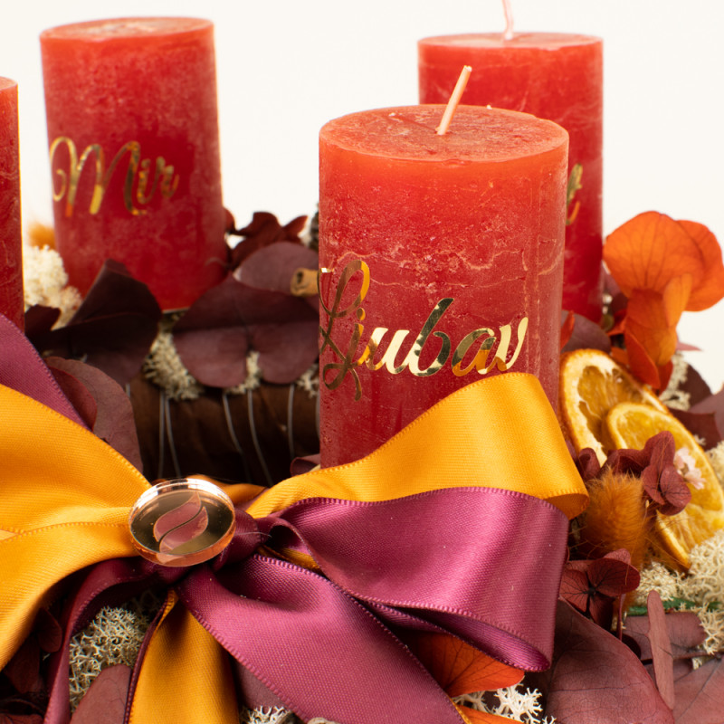 Središnji detalj čine četiri crvene adventske svijeće SANDEA sa zlatnim natpisima Nada, Mir, Radost i Ljubav – simboli četiri tjedna adventa.