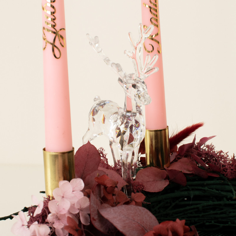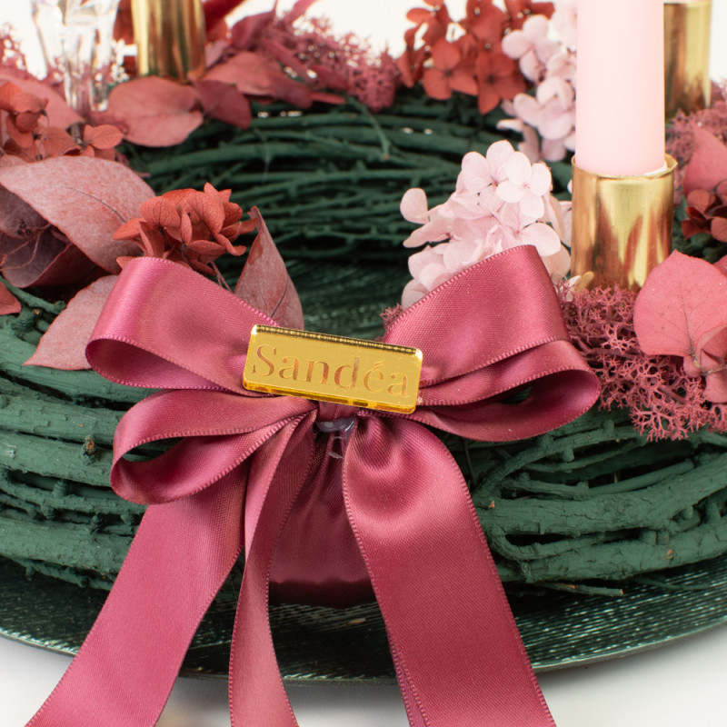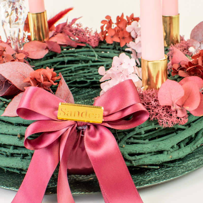 Središnji detalj je bordo satenska mašna s elegantnom metalnom pločicom SANDEA, koja dodaje notu luksuza i ručne izrade. Ružičaste svijeće u zlatnim držačima unose toplinu i mekoću, stvarajući nježan kontrast s bogatom zelenom podlogom od šiba.