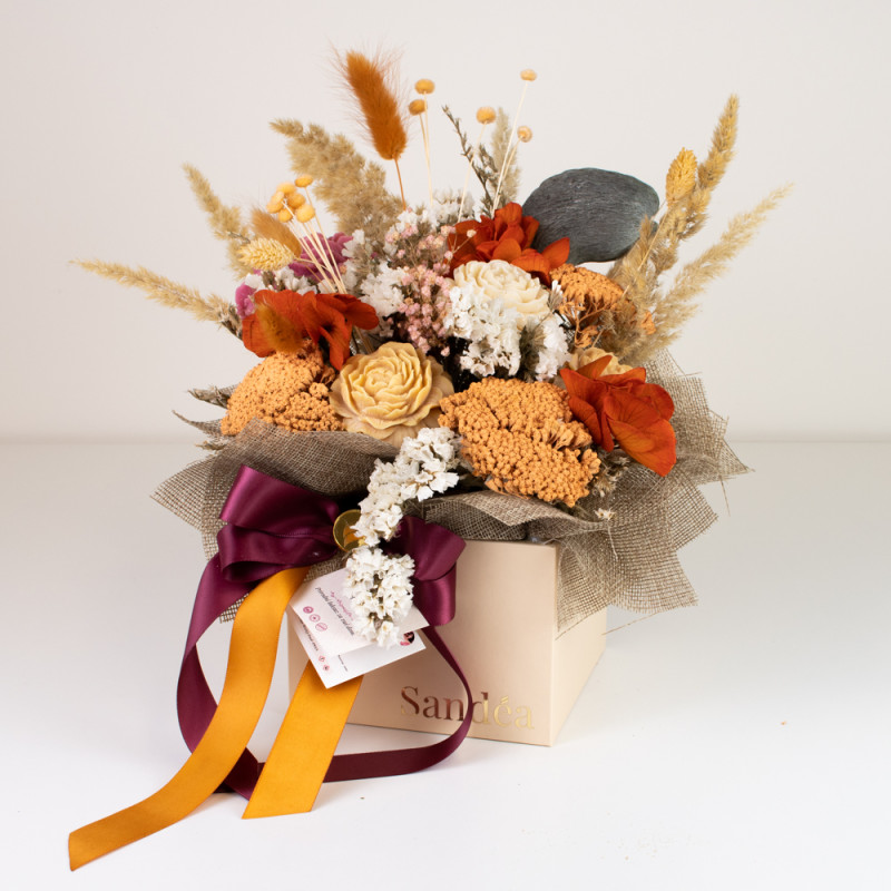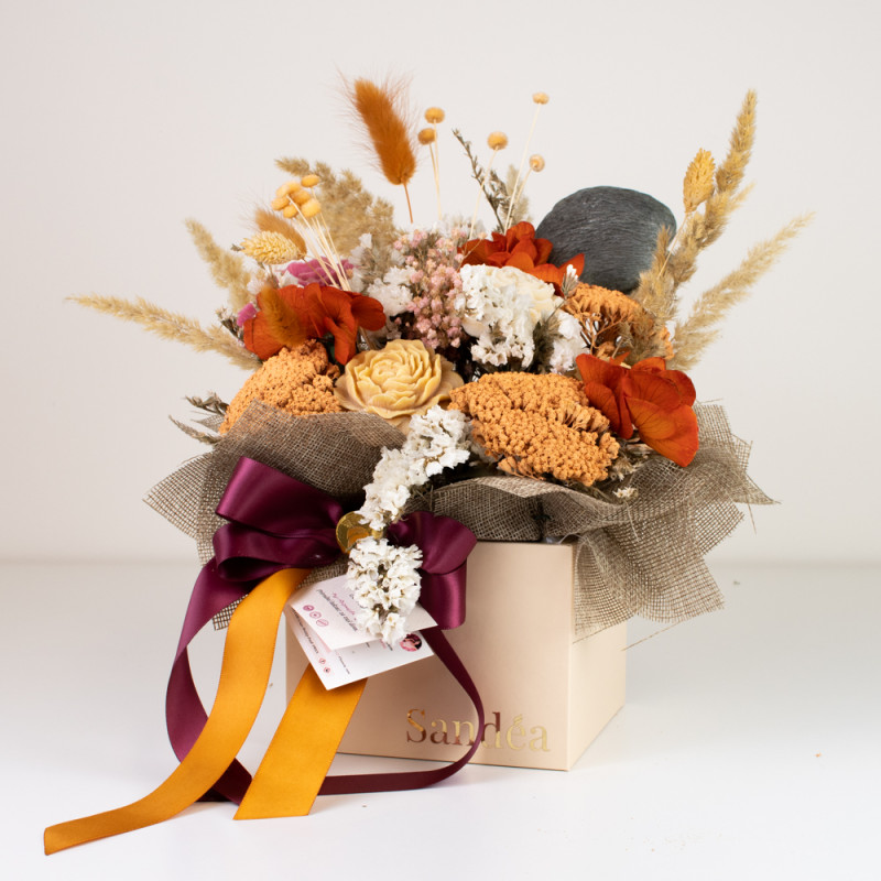 Aranžman od voska M – 02 donosi toplinu karamel, tamno bež i tamno puder roza nijansi u svaki interijer. Cvjetovi su izrađeni od 100 % biljnih voskova – kokosovog i uljano-repičinog – oblikovani u realistične ruže i božure. Njihove bogate nijanse stvaraju osjećaj luksuza i topline, dok se savršeno stapaju s pažljivo odabranim prirodnim dodacima.