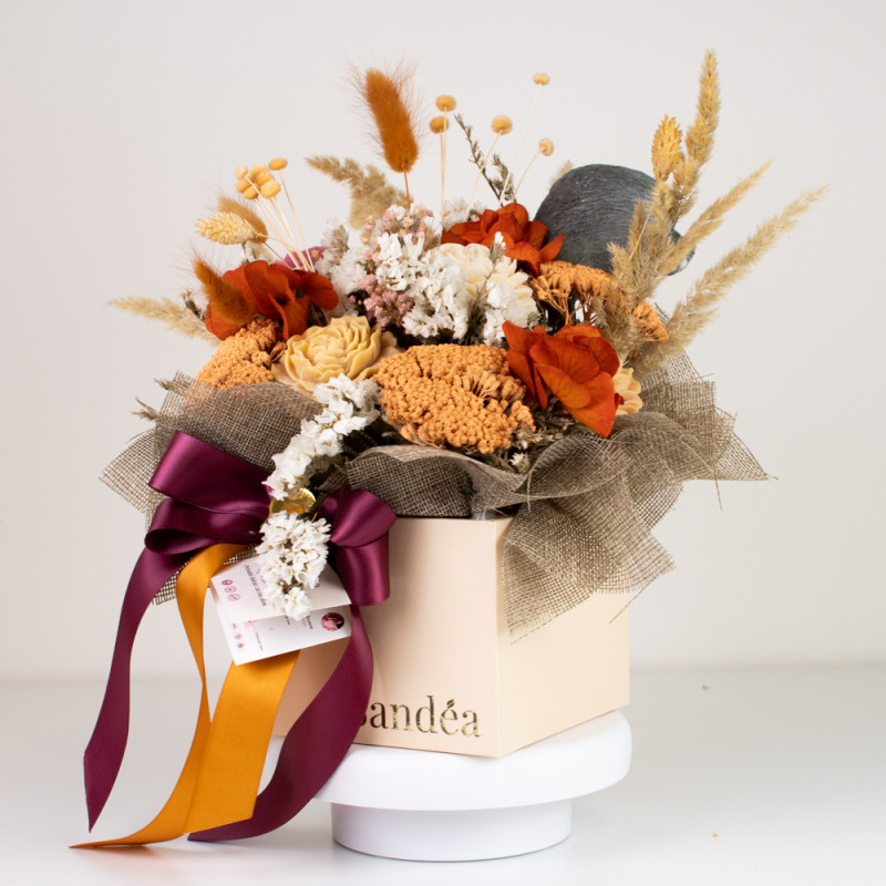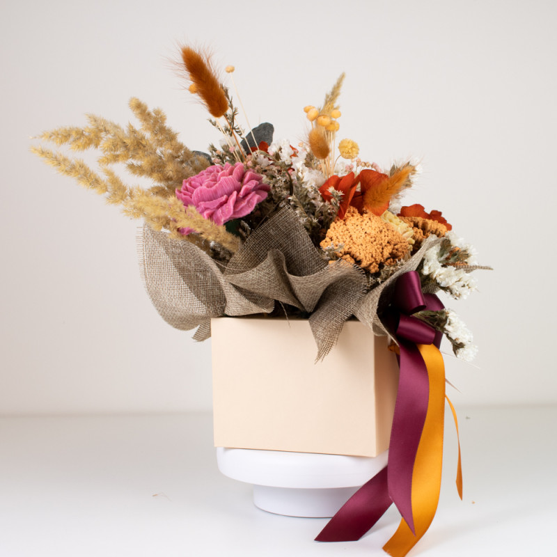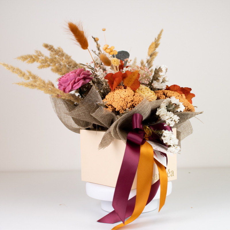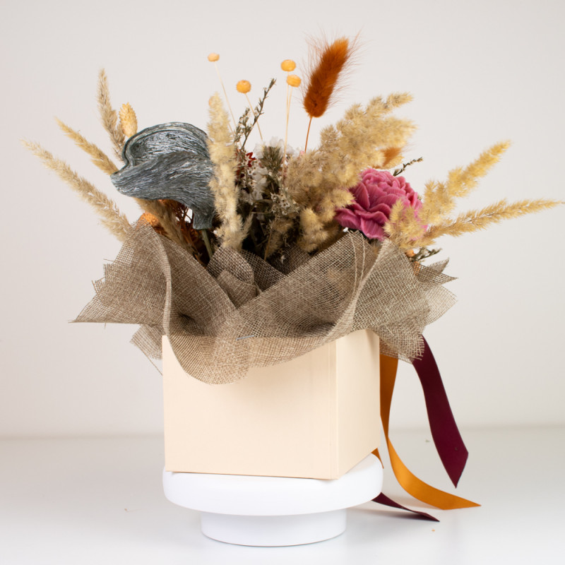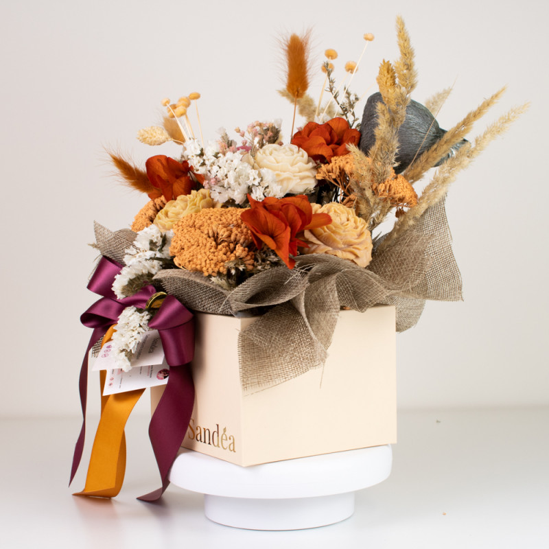 Kutija je ručno izrađena od tvrde kaširane podloge i ukrašena satenskom vrpcom u vinsko-ljubičastoj nijansi. Time se naglašava luksuzan karakter aranžmana, dok sama čvrstoća i kvaliteta kutije jamče dugotrajnost. Dimenzije (cca 12x12x10 cm, visina oko 25 cm) čine ga savršenim izborom za blagovaonske stolove, komode ili radne prostore.