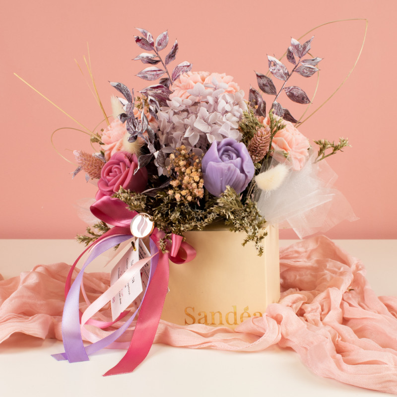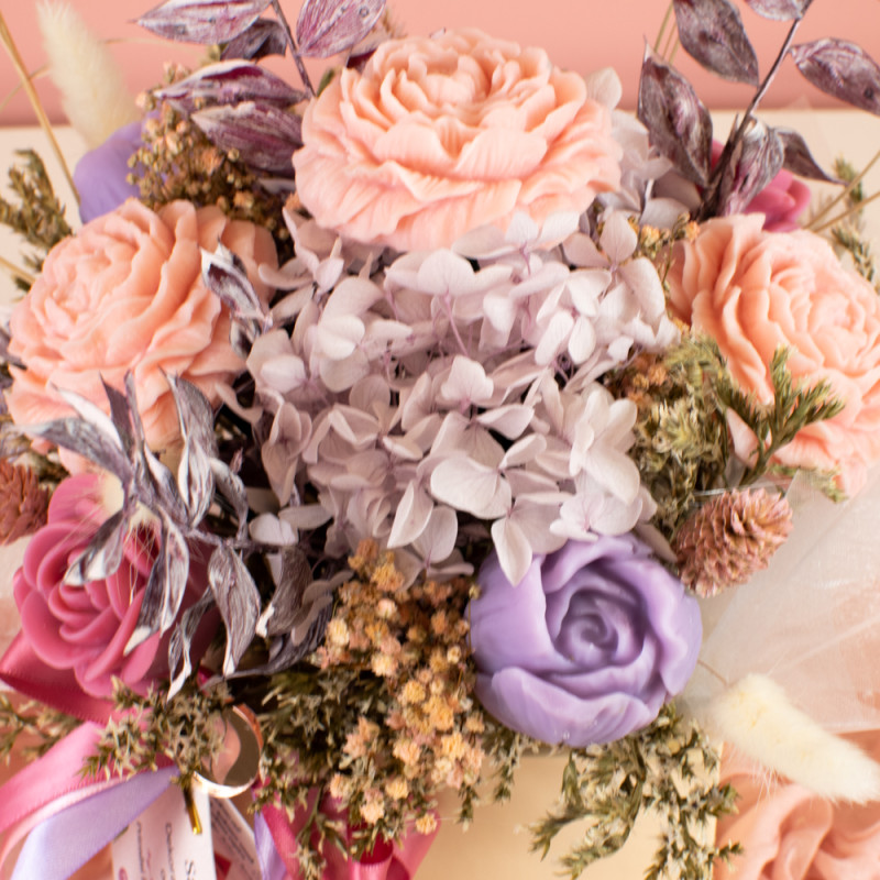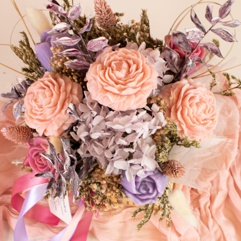 Aranžman od voska S – 01 kombinira nježne boje, prirodne materijale i luksuzan miris u dekorativni komad koji oplemenjuje svaki prostor. Cvjetovi su izrađeni od 100 % biljnih voskova – kokosovog i uljano-repičinog – oblikovani tako da oponašaju prirodni izgled božura i ruža. Ovaj mali aranžman od voska odiše profinjenošću, a zahvaljujući kompaktnim dimenzijama, lako se uklapa i u manje interijere.