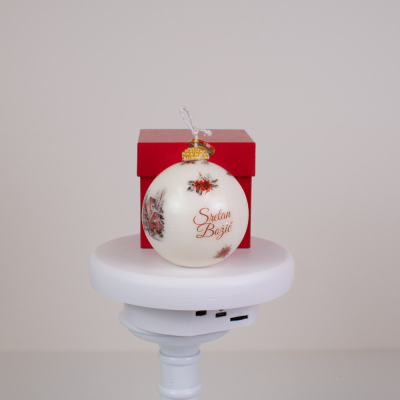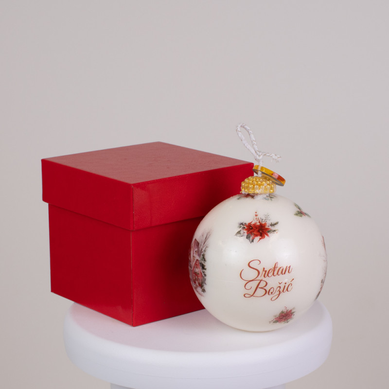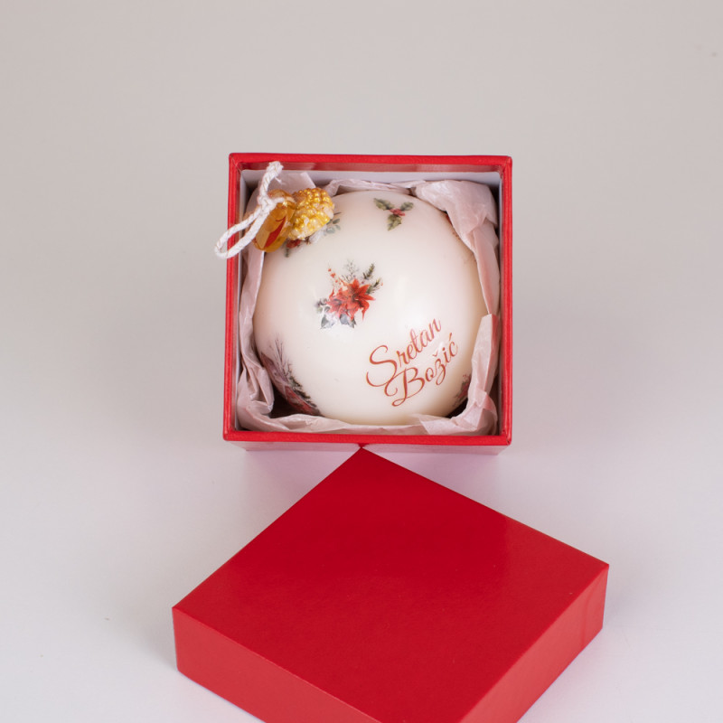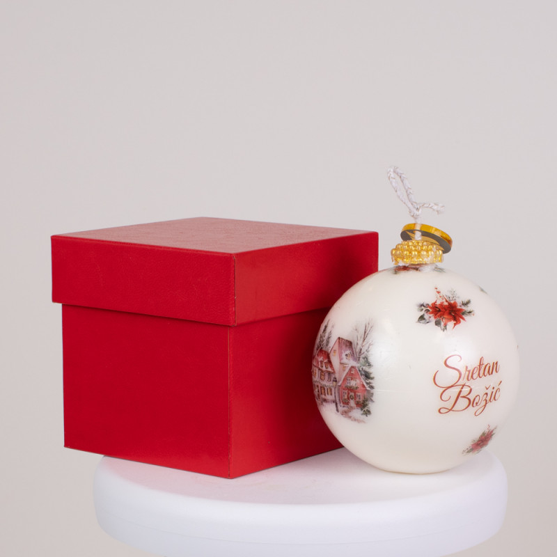 Svaka svijeća oblikovana je poput božićne kugle, s nježnim zimskim motivima i natpisom „Sretan Božić“ koji unosi osjećaj radosti i zajedništva. Dolazi u tvrdoj kaširanoj kutiji, izrađenoj ručno, koja svijeći daje luksuzan izgled i dodatnu zaštitu. Crvena kutija simbolizira ljubav, toplinu i duh blagdana – spremna je za poklon bez dodatnog omatanja.