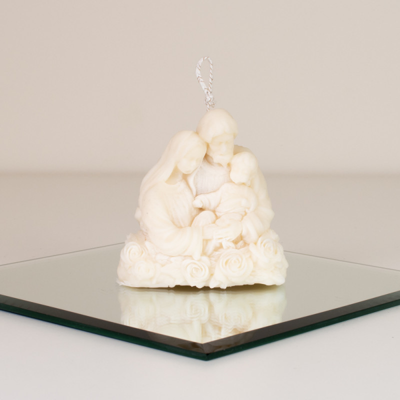 Ova ručno rađena svijeća prikazuje Mariju, Josipa i malog Isusa u mirnom i nježnom zagrljaju, simbolizirajući pravu bit Božića – ljubav, zajedništvo i mir.