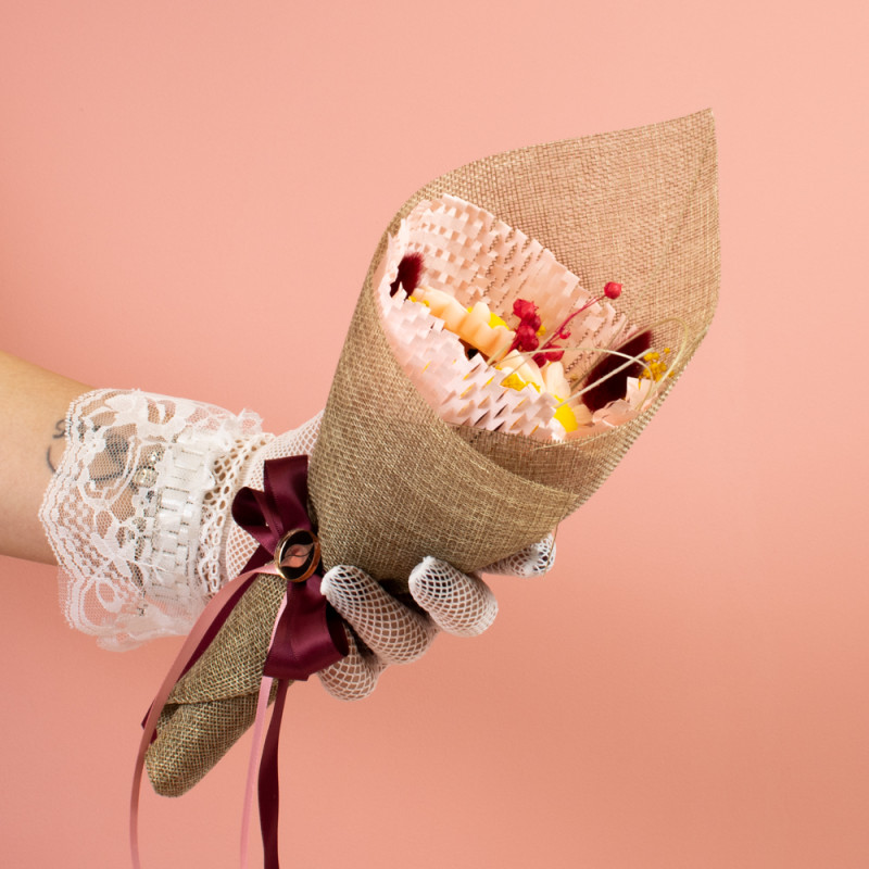 Ovaj mali aranžman od voska dolazi u rustikalnom platnenom omotu, ukrašen satenskom mašnom. Uz voskane cvjetove uključuje i suho cvijeće europskog podrijetla: gipsofilu, zečji repić i sitne stabilizirane grančice. Spoj voskanih margareta i prirodnih elemenata daje toplinu i prirodan izgled, što ga čini savršenim za dom, ured ili poklon.