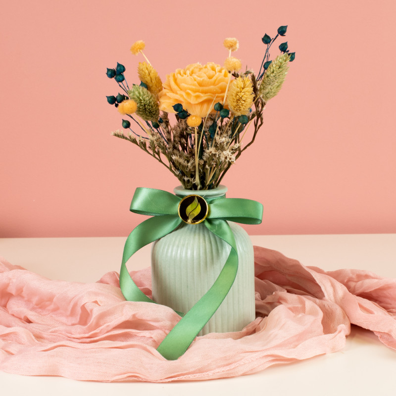 Oko njega se nalazi pažljivo odabrano suho cvijeće europskog podrijetla: gipsofila, mini klasja, sitni cvjetovi žute boje i zeleni biljni elementi koji zajedno stvaraju skladnu i živopisnu kompoziciju. Rezultat je cvjetni buket od voska koji unosi osjećaj svježine, iako je napravljen od trajnih materijala.