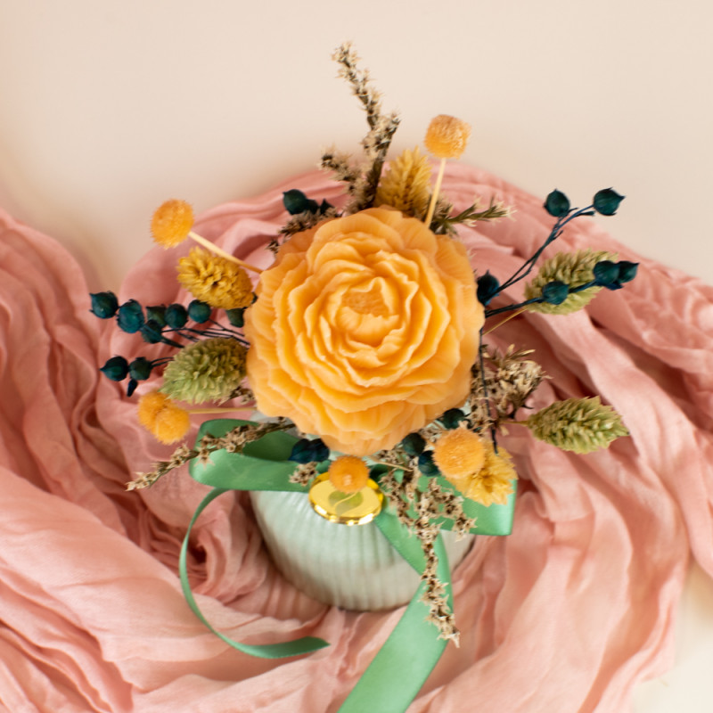 Golden Bloom – buket od voska s narančastim cvijetom spaja energiju boja i dugotrajnu ljepotu voska u dekoraciju koja podiže svaki prostor. Središnji cvijet, oblikovan od 100 % biljnog voska (kokos i uljana repica), ističe se bogatom narančastom nijansom i detaljno izrađenim laticama koje izgledaju poput pravog cvijeta.