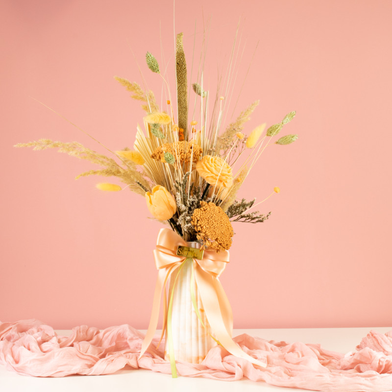 Buket je obogaćen bogatom kombinacijom suhog i stabiliziranog cvijeća: sušena tatarica, palma, pampas trava, falaris, zečji repić, sušena achillea, nježne dekorativne trave i osušeni boton mini. Ovi elementi dodaju volumen, strukturu i rustikalni šarm, pretvarajući buket u skladan spoj topline i elegancije.