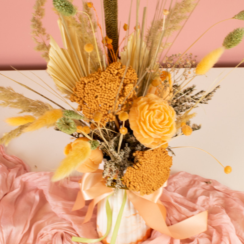 Buket od voska s božurom utjelovljuje eleganciju, prirodnu inspiraciju i dašak luksuza. Spoj ručnog rada, kokosovog voska i prirodnog suhog cvijeća donosi unikatnost, a dodatak mirisnog ulja božura pretvara ga u pravo multisenzorno iskustvo koje će oplemeniti svaki prostor.