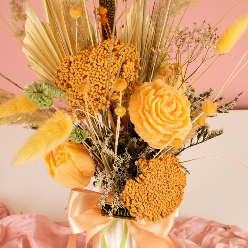 Buket od voska – Narančasti božur i tulipani spaja živopisne boje i trajnu ljepotu u jedinstvenu dekoraciju koja ostaje postojana godinama. Izrađen ručno od 100% kokos voska, ovaj raskošni aranžman oduševljava realističnim izgledom i detaljima koji vjerno oponašaju prirodne cvjetove.