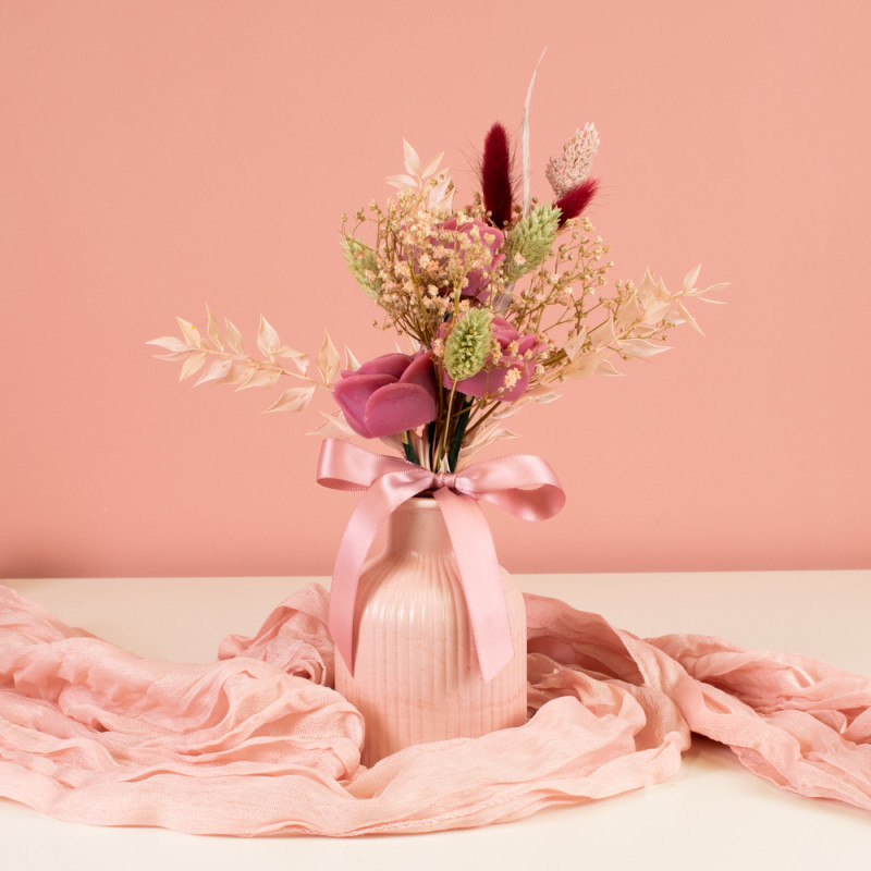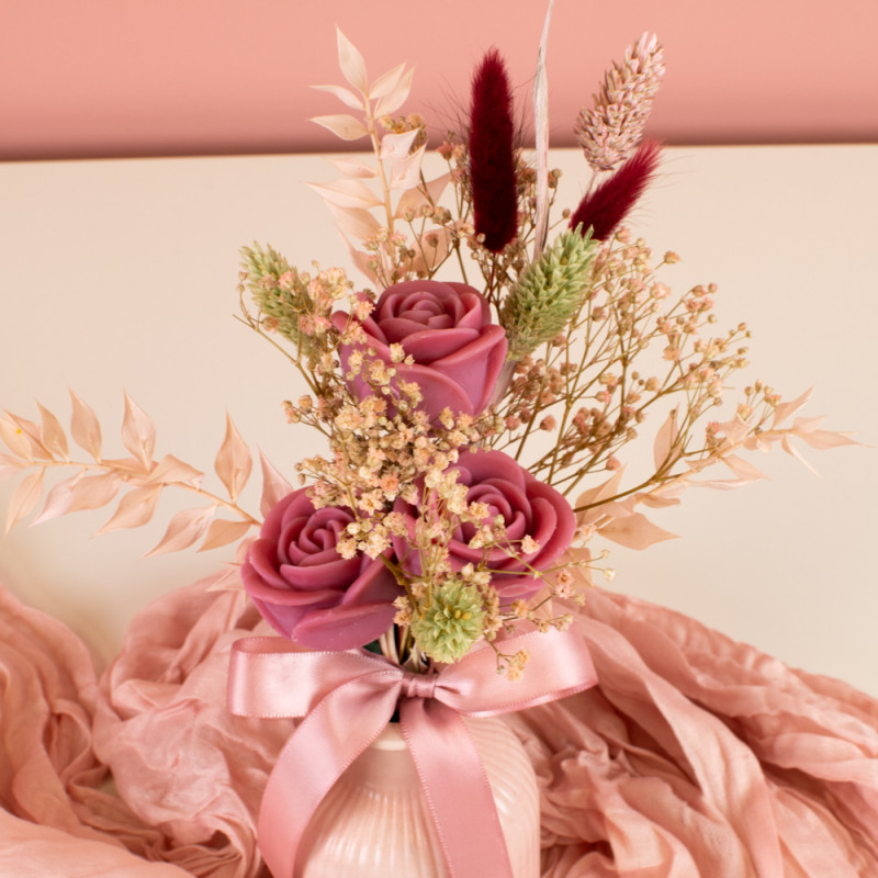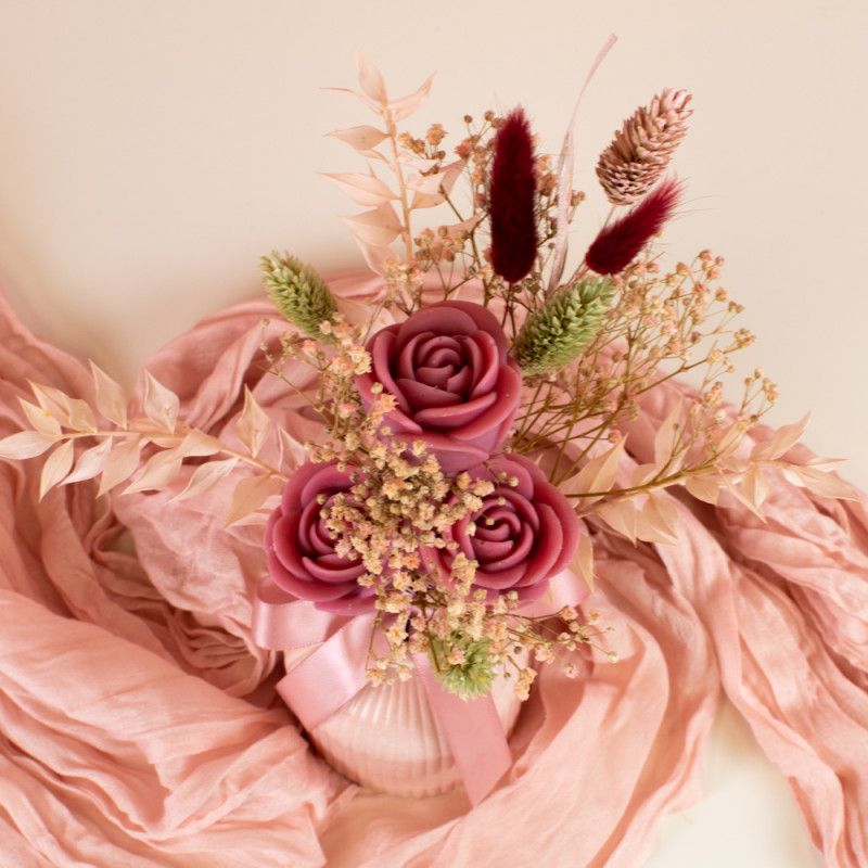 U sastavu buketa nalaze se tri voskaste ružice u ružičastoj nijansi, stabilizirani ruskus, gipsofila, suhi falaris i zečji repić. Ove vrste suhog i stabiliziranog cvijeća dodaju razigranost, teksturu i različite tonove boja, čineći kompoziciju prirodnom i estetski uravnoteženom.