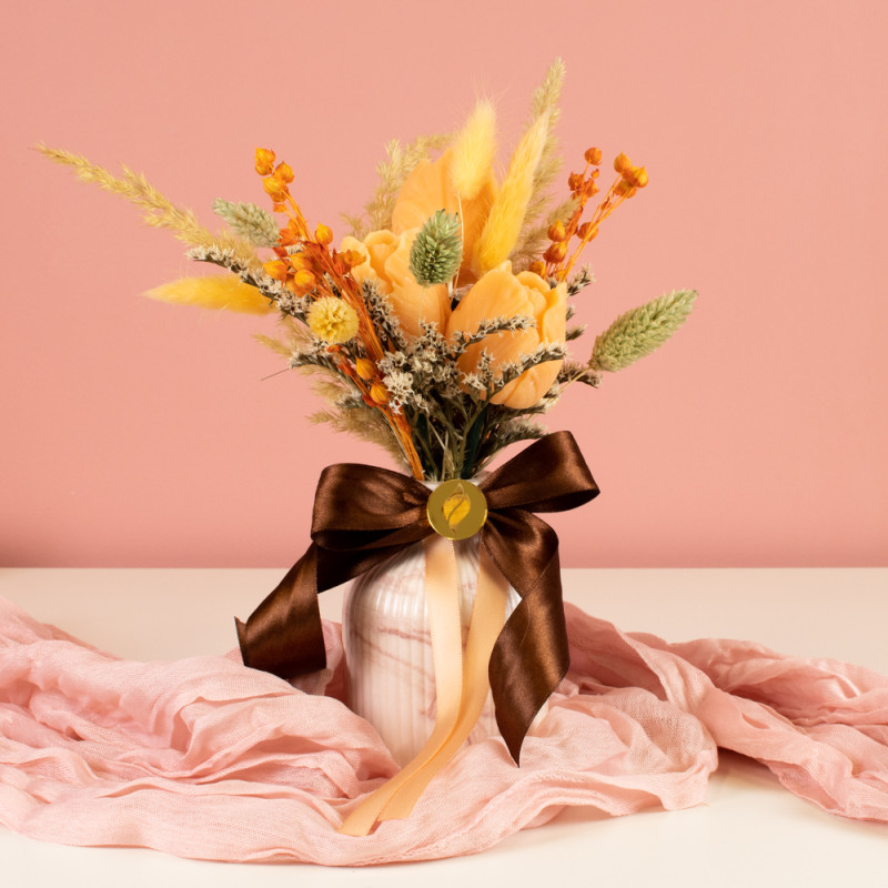Oko tulipana raspoređeno je pažljivo odabrano suho cvijeće: falaris, zečji repić, mini pampas i tatrica. Ove vrste suhog cvijeća dodaju teksturu, pokret i razigranost cijelom sastavu, dok kontrastne boje i oblici naglašavaju eleganciju voskastih tulipana. Rezultat je trajni cvjetni buket od voska koji izgleda svježe, ali ostaje postojan bez obzira na vrijeme.