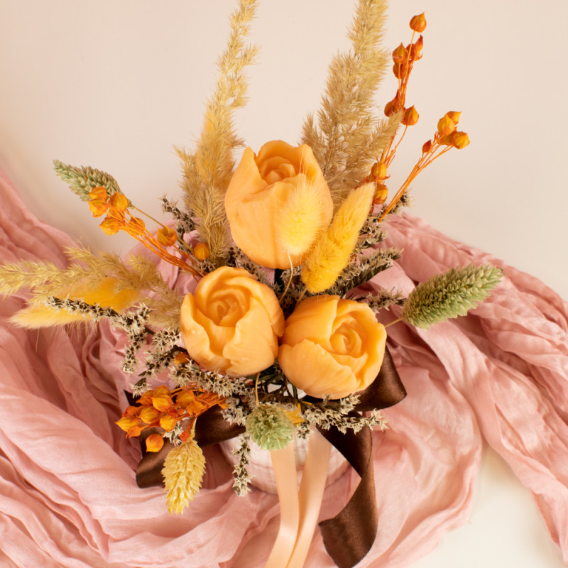 Buket od voska s tri tulipana donosi jedinstvenu kombinaciju prirodne ljepote i dugotrajnosti. U središtu buketa nalaze se tri tulipana u narančastoj boji, oblikovana od 100 % biljnog voska (kokos i uljana repica). Njihov izgled, detaljno oblikovane latice i bogata boja, čine ih gotovo neodoljivo sličnima pravim tulipanima.
