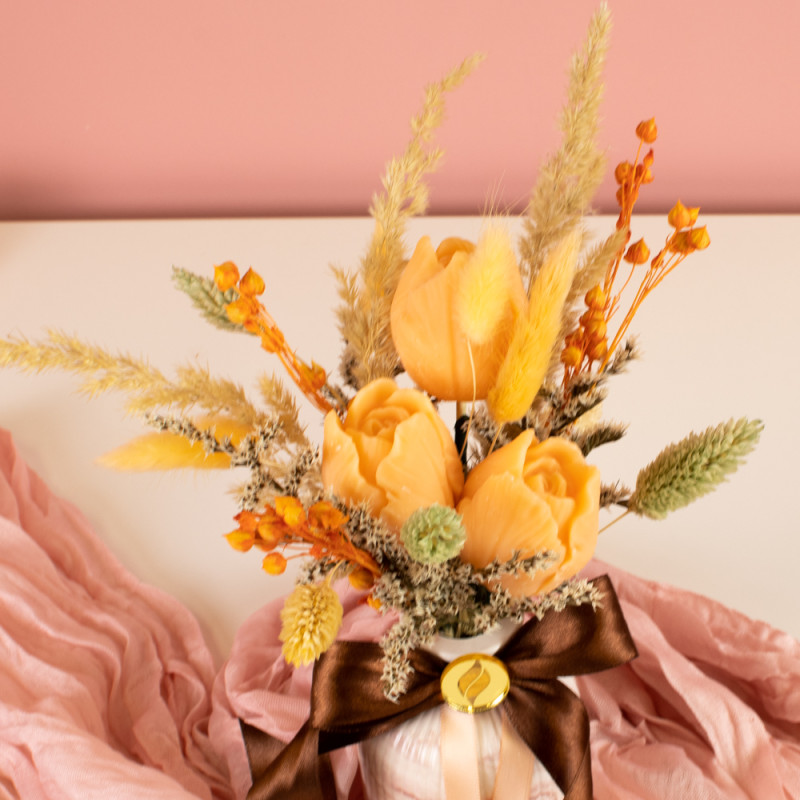 Kombinacija tulipana od voska i suhog cvijeća čini ovaj buket savršenim spojem prirodnih materijala i umjetničkog izraza. Ako tražite dekoraciju koja traje, a izgleda svježe i prirodno, ovaj buket od voska je pravi izbor.