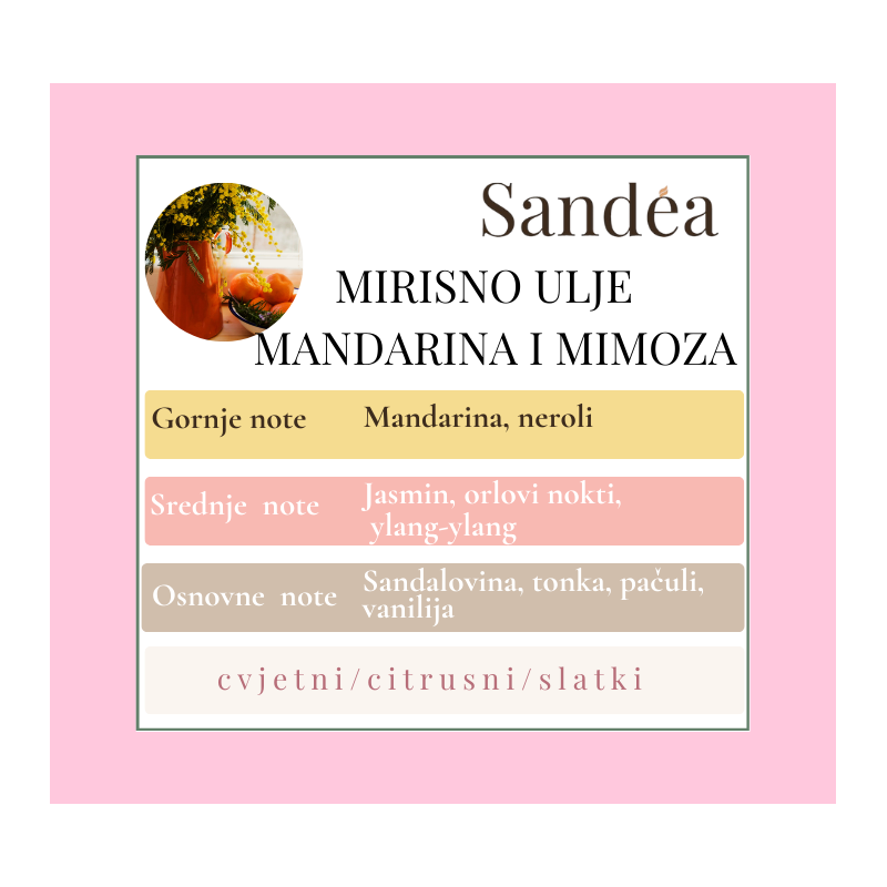 U gornjim notama dominira sočna mandarina i nježni neroli, koji unose osjećaj vedrine i lakoće već pri prvom udahu. Srednje note donose cvjetni buket jasmina, orlovih noktiju i egzotičnog ylang-ylanga, koji prostoru daju mekoću i toplinu. U osnovi mirisa otkrivaju se sandalovina, tonka, pačuli i vanilija, čineći kompoziciju dugotrajnom, zaokruženom i elegantnom.