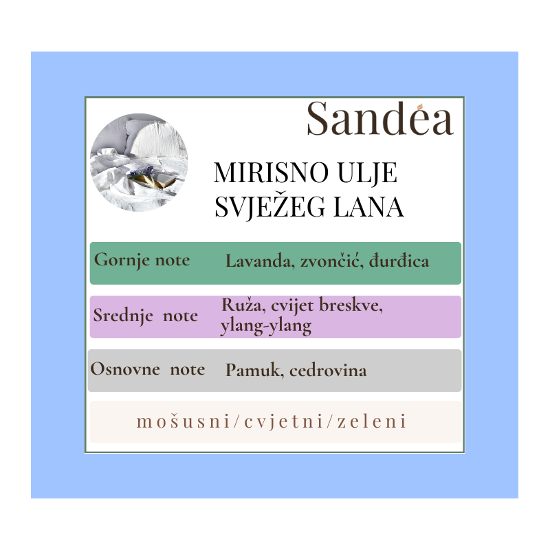 Uz note lavande i ruže koje opuštaju, te svježinu pamuka i cedrovine koja donosi stabilnost, ovaj difuzor stvara atmosferu mira i ugode. Ako želite da vaš automobil uvijek miriše poput svježe opranog platna, onda je difuzor za auto Svježi lan pravi izbor za vas.