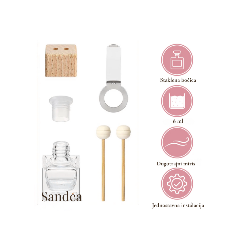 Njegov dizajn je elegantan i praktičan – mala bočica od 5 ml savršeno stane u svaki automobil i traje do četiri tjedna. Drveni čep omogućuje prirodnu difuziju mirisa, dok se praktična kopča lako pričvrsti na ventilacijski otvor. Kada želite pojačati intenzitet mirisa, dovoljno je lagano nagnuti bočicu i pustiti da drvo upije mirisno ulje.