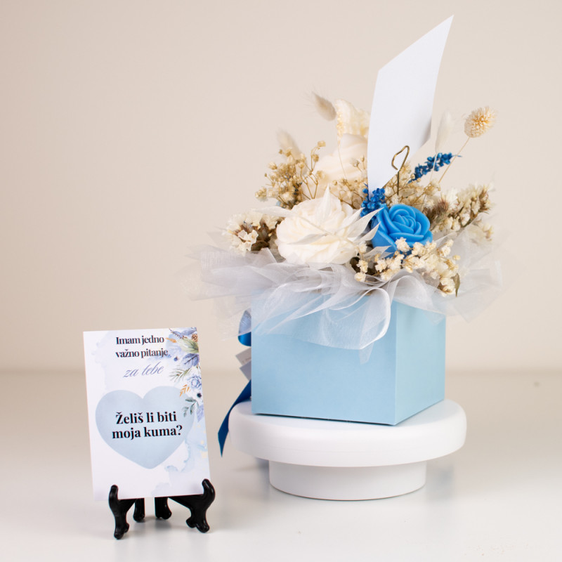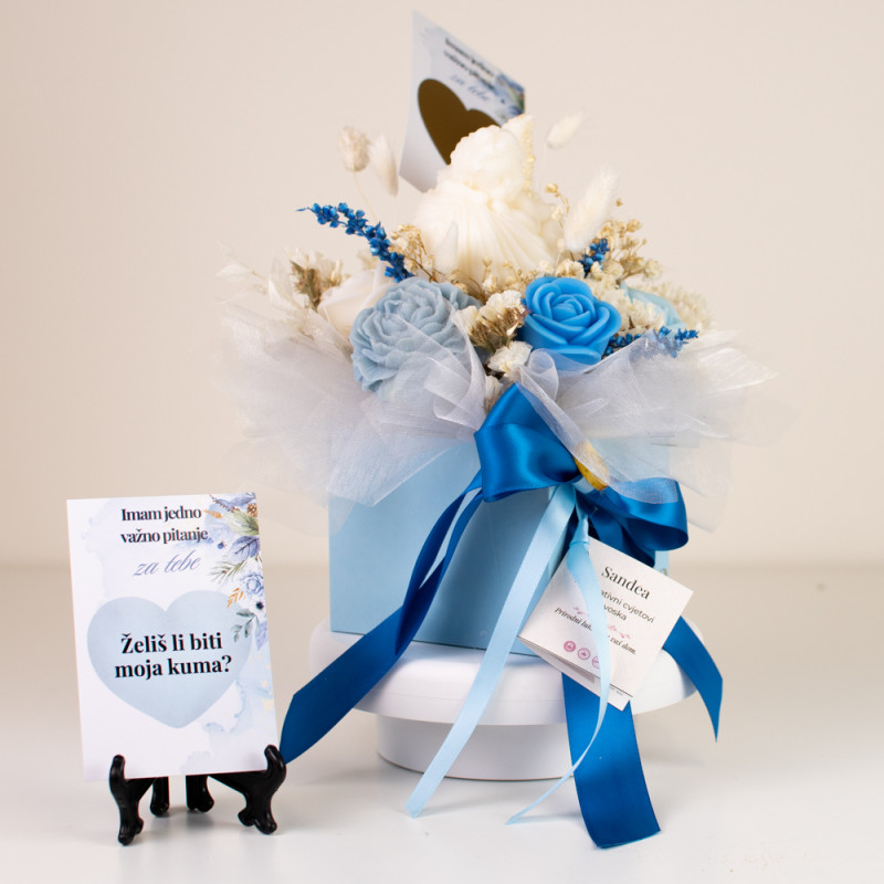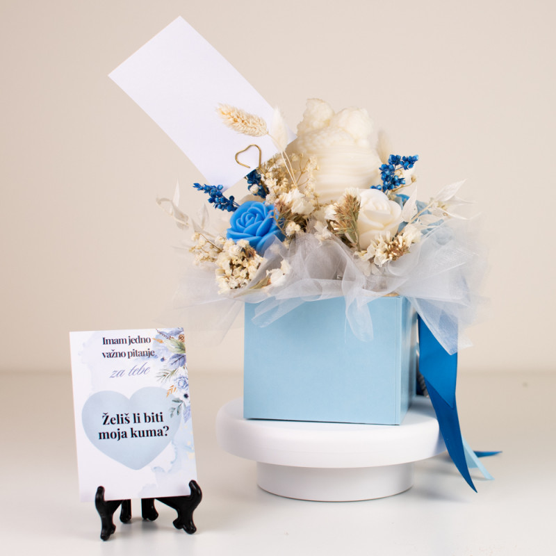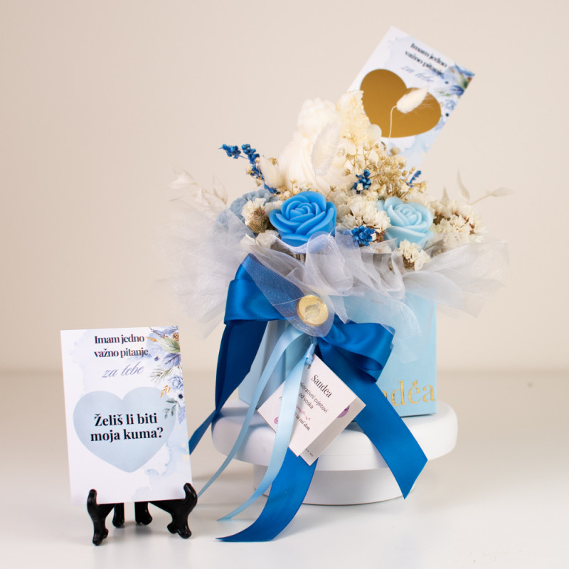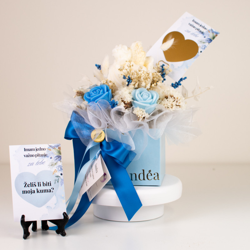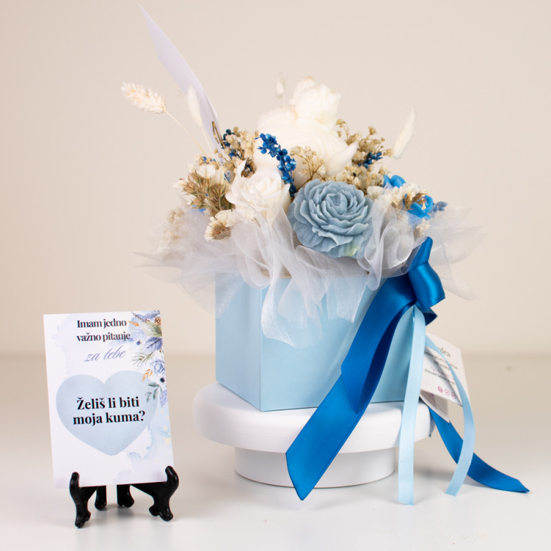 Aranžman dolazi u kutiji ručnog rada u nježnoj plavoj boji, ukrašenoj plavom i bijelom satenskom mašnom.