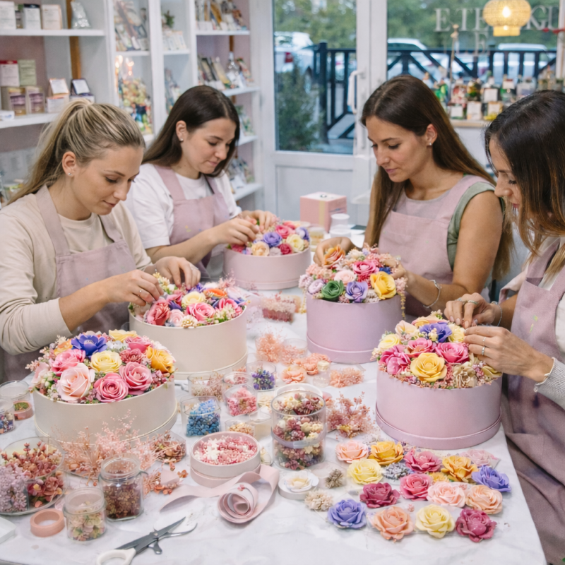 Na radionici vas čekaju unaprijed izrađeni cvjetovi od voska u raznim bojama, suho cvijeće, pripremljene kutije, ukrasne trake i dekorativni papir. Vaš zadatak je složiti vlastitu kompoziciju – prema vlastitom osjećaju, stilu i željenoj atmosferi.