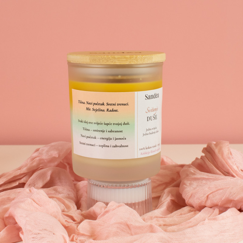Svitanje duše svijeća povezuje smirenost sandalovine, svježinu bergamota i limete te vedrinu cvijeta naranče. Ona nije samo prirodna mirisna svijeća, već unutarnje putovanje.